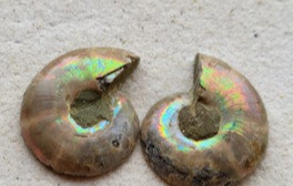 Iriserende ammoniet fossiel setje..34x30mm met lichte regenboogkleuren