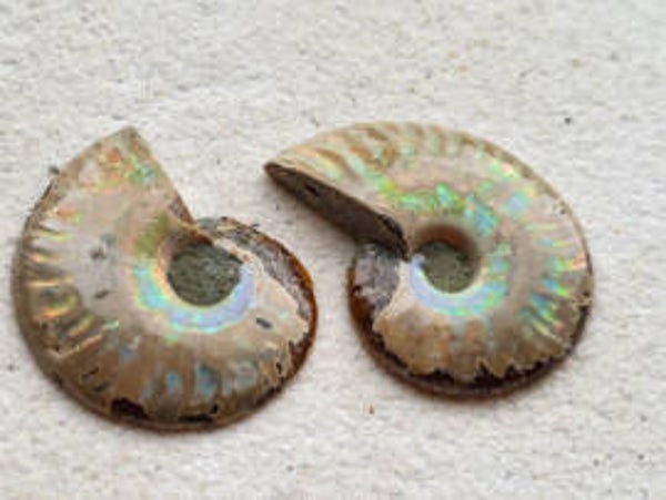 Iriserende ammoniet fossiel setje..45x35mm met lichte regenboogkleuren