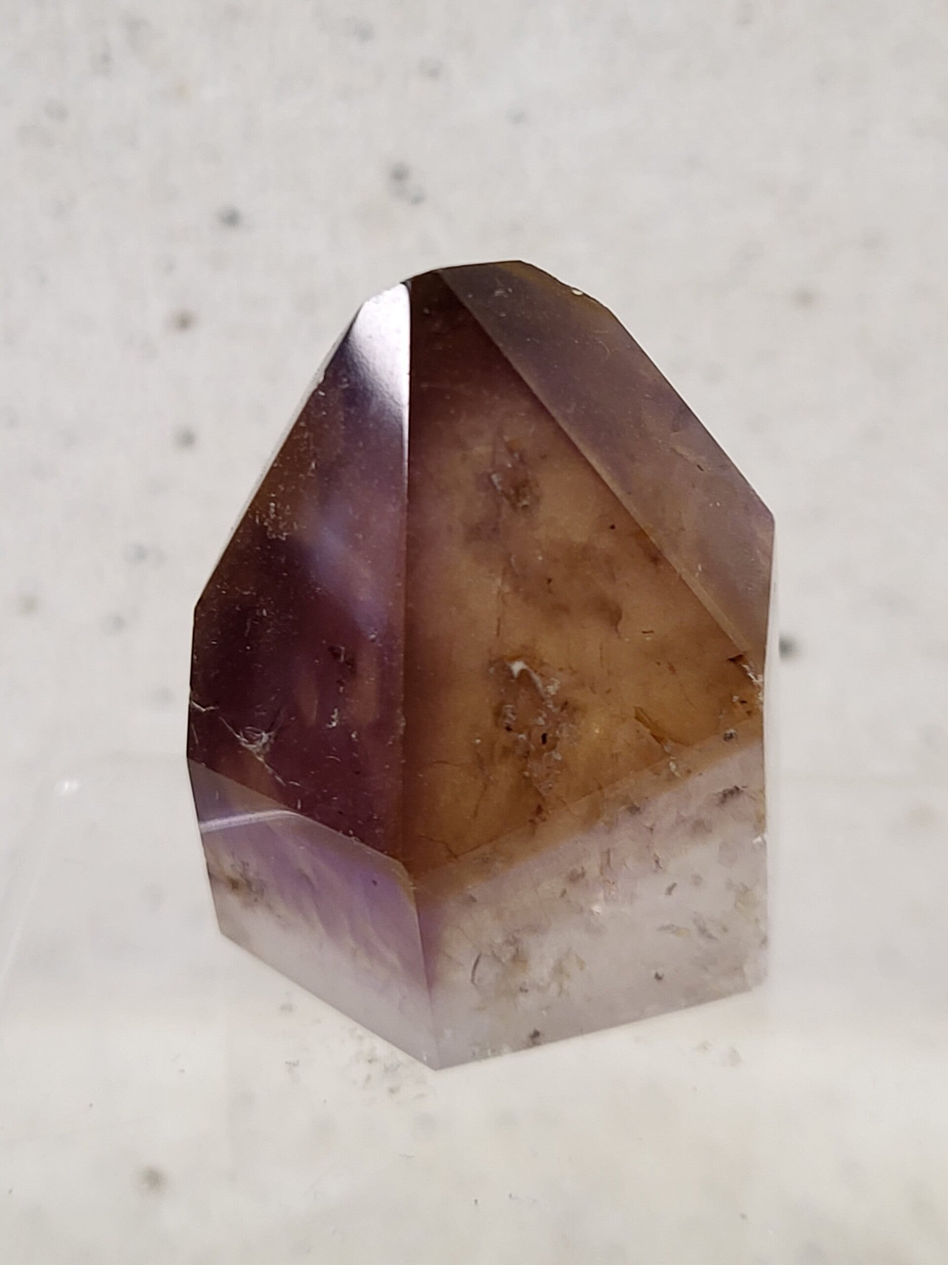 Lemurisch kristal (Golas, Brazilië) gehuld in een jasje waaronder amethist, hematiet, lateriet en soms insluitsels van goethiet, rutielkwarts of chloriet. Helpt bij het afpellen van laagjes van jezelf. Is een zachte, vriendelijke en geduldige manier van zelfverwezelijking. Ieder mens heeft een lichtkern en een dreamcoat Lemurische helpt om deze kern nog meer te openen.