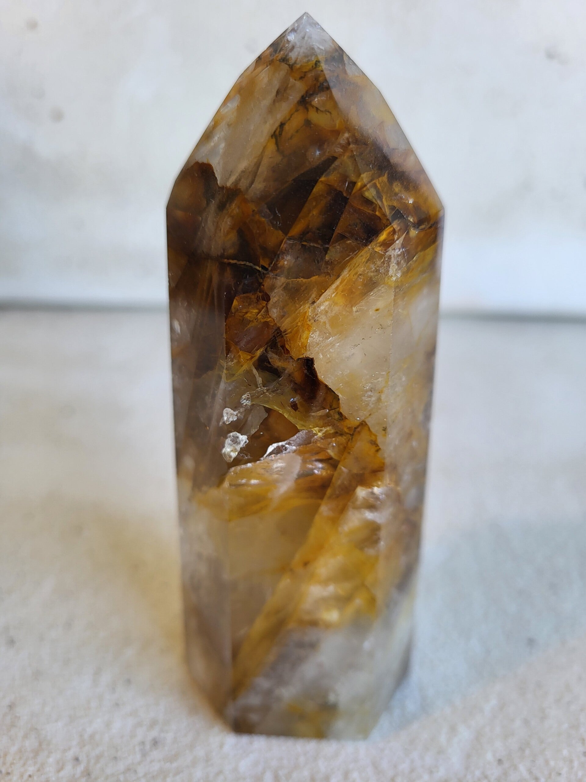 Dit zijn kwartssoorten (bergkristal) met een ijzerverbinding en daardoor krijgen ze een oranje of rode kleur. Deze limonietkwartsen zijn er van geel, bruin tot zelfs zwart.. Als de kleur goud is dan correspondeert het met de zonnevlecht en de rode soort meer met jouw basis. Zoals vele edelstenen en mineralen heeft deze soort weer meedere namen zoals: hematietkwarts, goethietkwarts, hematiode kwarts, ijzerkwarts en moerasijzer. De originele gouden healer kwam uit Arkansas maar komt onder andere ook uit Brazilie zoals deze.