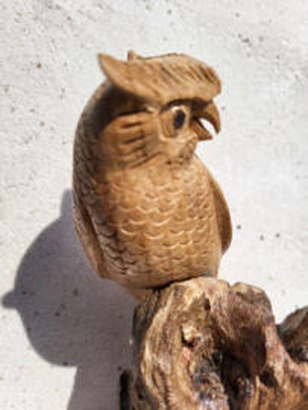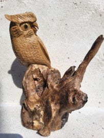 Fairtrade uil op moerashout stronk van handgesneden suar hout. 16x13cm