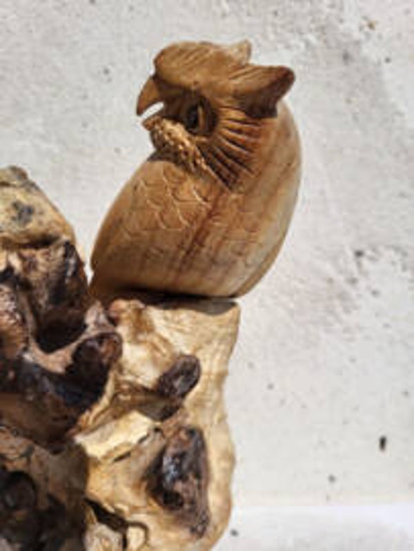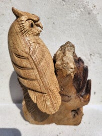Fairtrade uil op moerashout stronk van handgesneden suar hout. 16x11cm