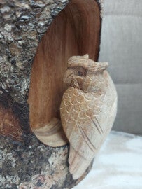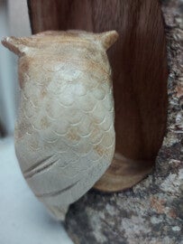 Fairtrade uil in boomstam stam gesneden suar hout. Met gaatje aan achterkant om evt op te hangen