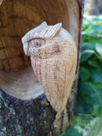 Fairtrade uil in boomstam stam gesneden suar hout. 20x17x9 cm Met gaatje aan achterkant om evt op te hangen