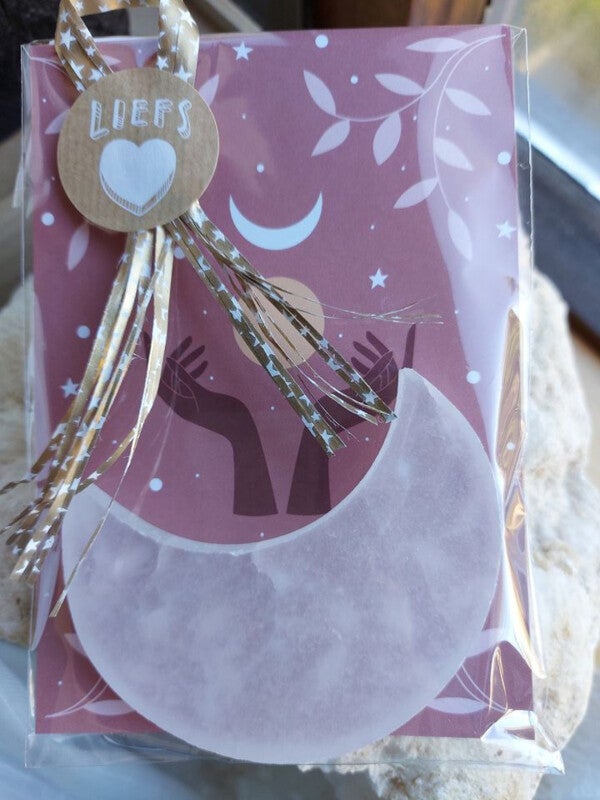 Grote seleniet of satijnspaat maan, rond de 85mm verpakt met kaart vintage met handen een maan en sterren , met beschrijving seleniet in zakje met strik en als super leuk en mooi cadeau om te geven