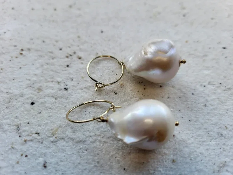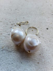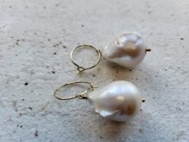 Grote zoetwater barok parels aan verguld op edelstaal creolen, totale lengte 43mm