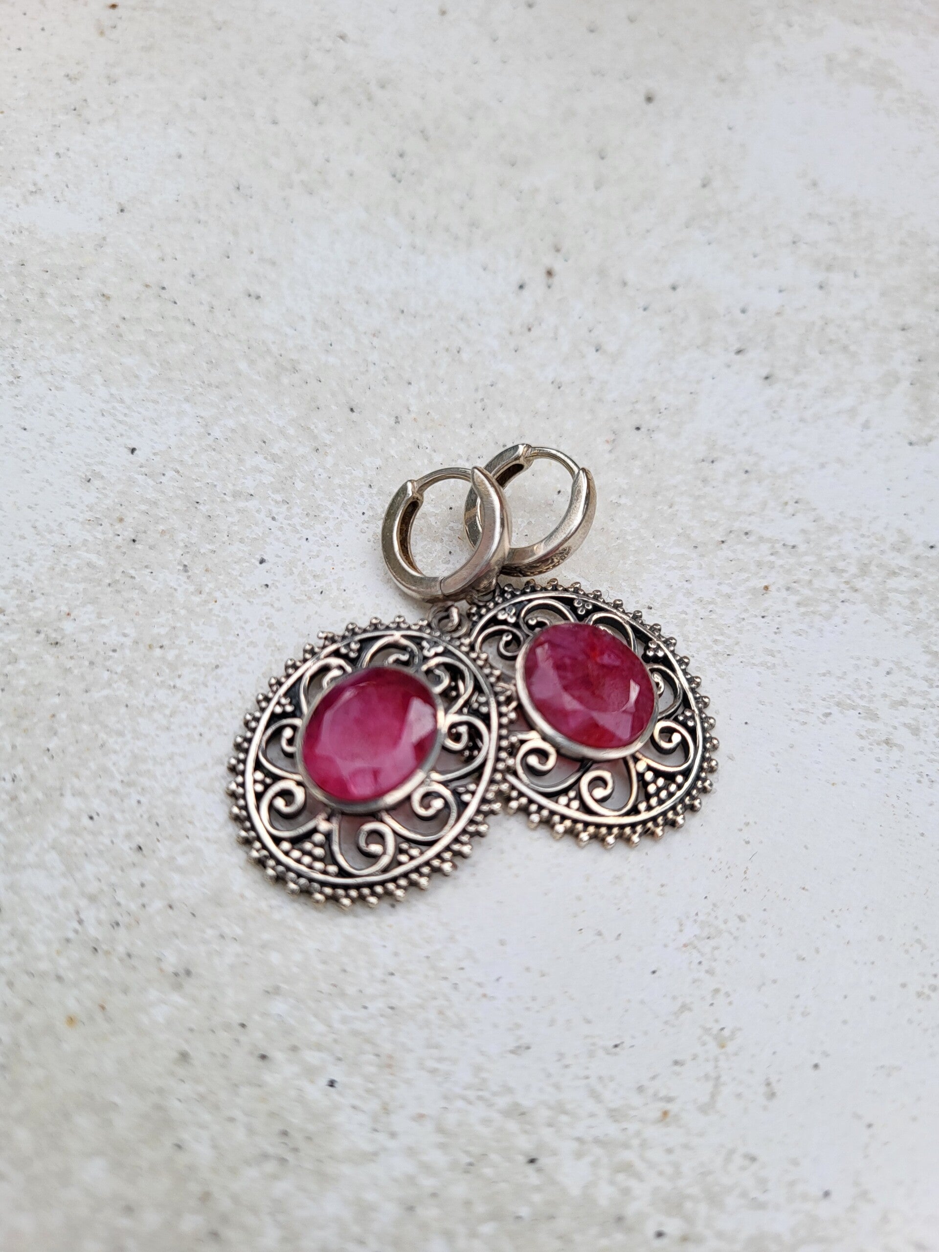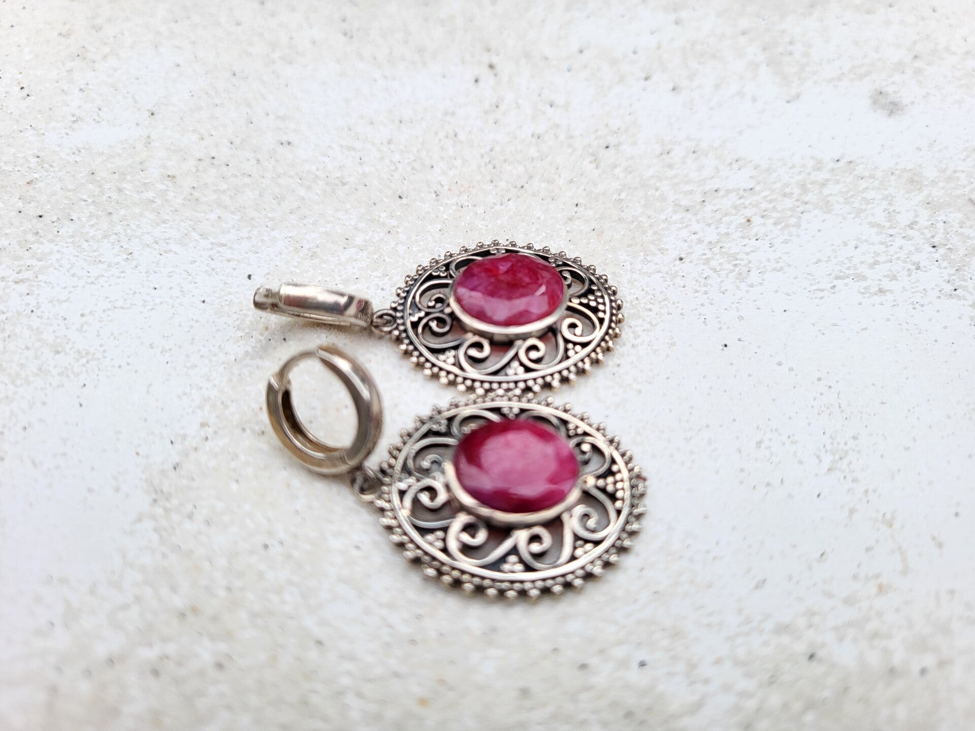 Prachtige 925 zilveren oorhangers ( klapcreooltjes) met robijn , lengte 40mm