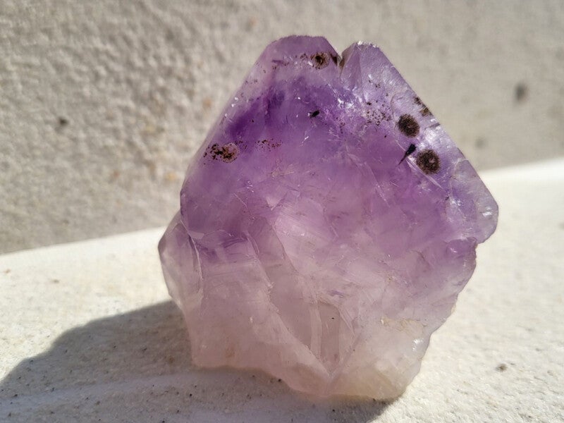 Amethist kalmeert en stimuleert de geest. Door rust te geven krijgt u diepere inzichten. Heft zorgt voor betere concentratie en beheersing van uw vaardigheden. Een zeer krachtige en beschermende steen met een hoge trilling. Fijn bij mediteren en blokkeert de negative energieën. Helpt bij stress, onrust, bloedsomloop en slapeloosheid en deze lichte soort ook bij hoofdpijn. Helpt bij geestelijke en lichamelijke reiniging , spiritueel inzicht. Ook geschikt om een ruimte te reinigen en geeft samen met rozenkwarts en bergkristal een harmoniserende energie in uw huis. Reinigt ook andere stenen.