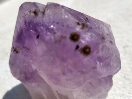 Prachtige amethist punt ( natuurgevormd) met vele insluitingen en regenboogjes, prachtig om goed te bekijken met loep. Vindplaats Brazilie 50x52x39mm. zie ook de puntjes waar hij heeft vastgezeten aan ander kristal of mineraal zoals bv stalachtiet