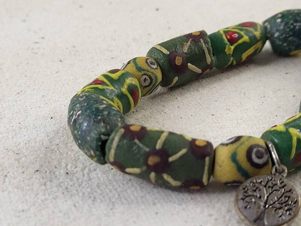 Fairtrade armband van handgemaakte glaskralen , gemaakt door de Krobo stam uit Ghana die woont bij de heilige berg. mt 16,17 maar is met rekbaar elastiek, bedel tree of life.....oerenergie.....
