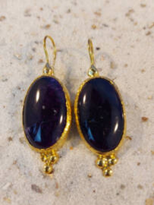 Deze prachtige diep amethist (bijgekleurd ) 24 karaat gouden oorbellen (op messing) worden in een kleine oplage gemaakt. Deze sieraden worden door een Oezbeeks familiebedrijfje uit Pakistan gemaakt zodat zij in hun levensonderhoud kunnen voorzien. lengte 45mm