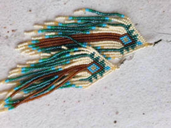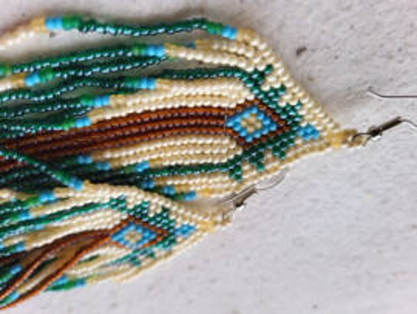 "Native" kralen oorbellen, 1 met zilverkleurige oorhaakjes 130mm lang (wil je tegen meerprijs 925 zilveren haakjes , vraag dan wat mogelijk is )