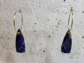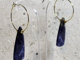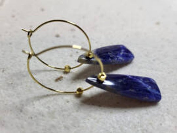 Gouden oorringen 25mm met sodaliet hangers en vermeil kraaltjes, totale lengte 51mm