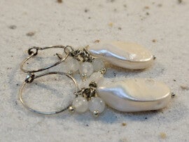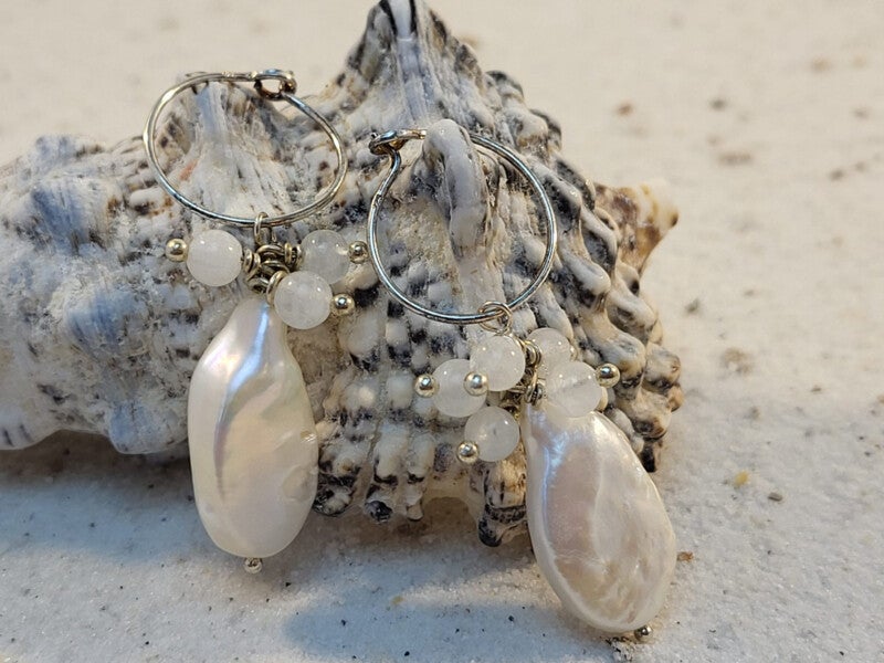 Zoetwaterparel oorbellen met regenboog maansteen