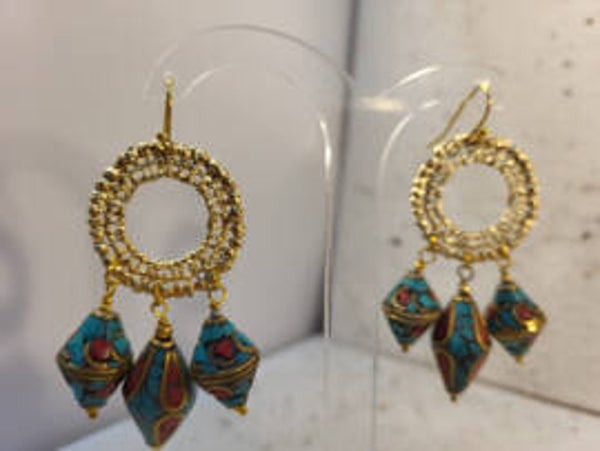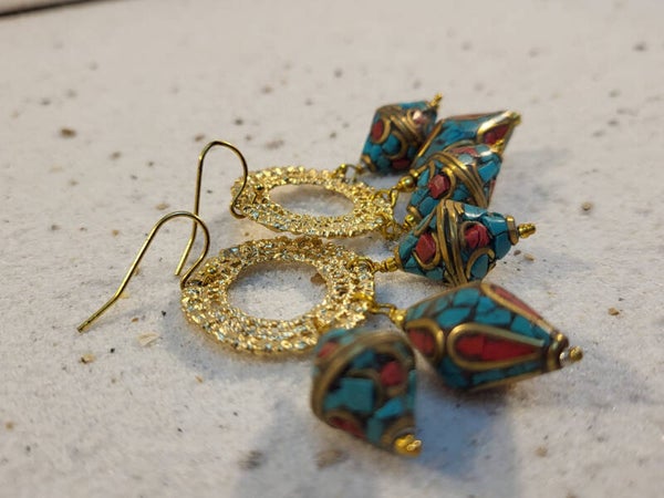 Mooie grote goudkleurige oorhangers ( 61mm lengte ) met bedels turkoois en koraal( Tibet)