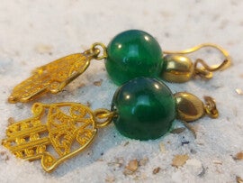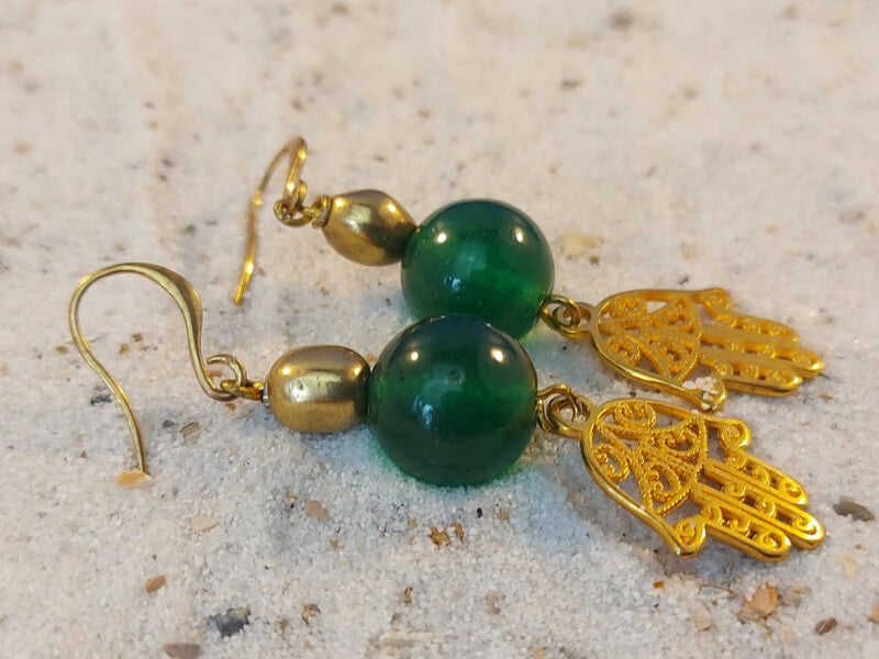 55mm lange goudkleurige oorhangers met Hamsa/gelukshandje en (bijgekleurd) agaat