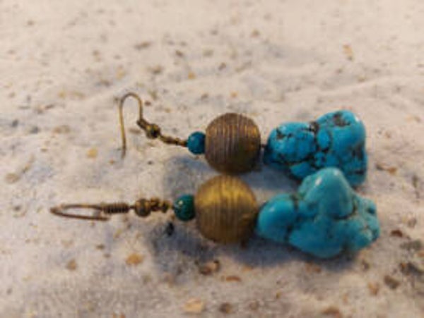 Bronzen oorhangers met handgemaakte bronzen kralen uit Ghana en grote kralen van echte turkoois , lengte 54mm