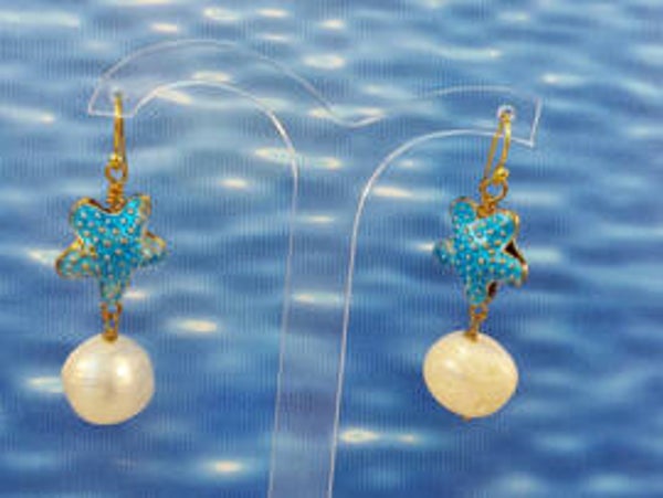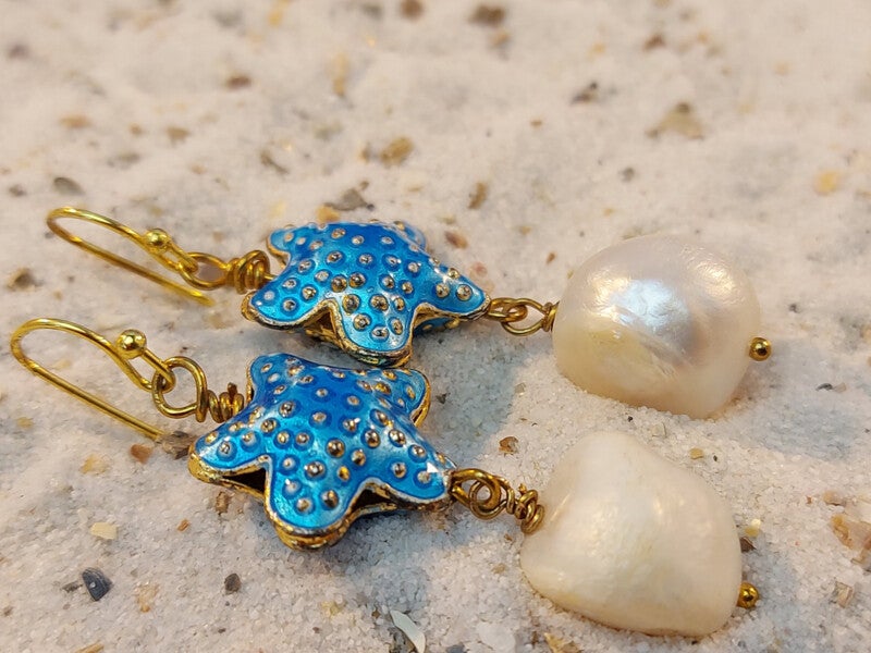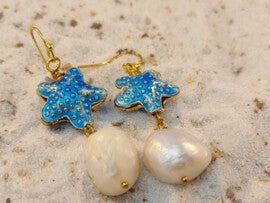 Summervibes met deze oorbellen met geëmailleerde zeesterren en 15mm zoetwaterparels. Lengte 51mm