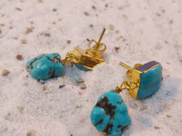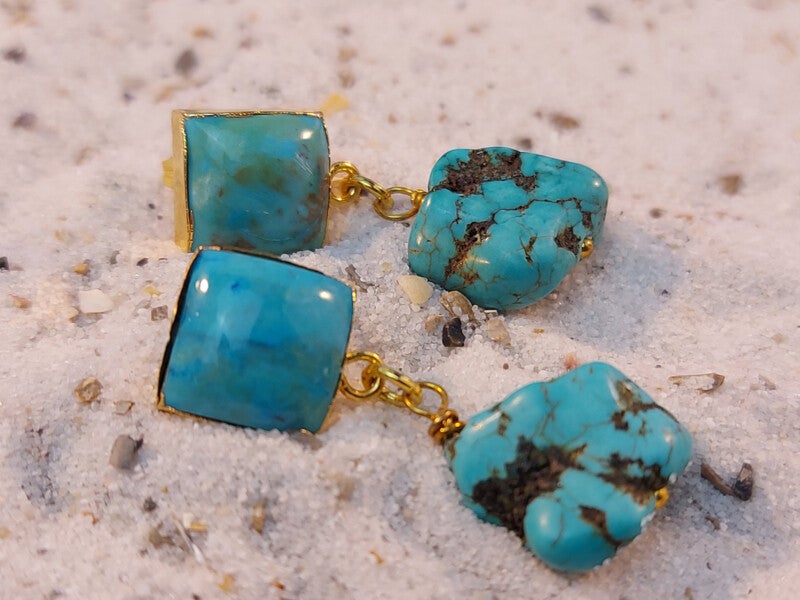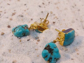 verguld op messing turkoois oorbellen met howliet en echt turkoois klompje. Lengte vanaf steker 29mm