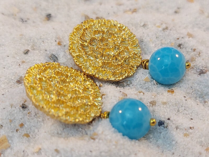 Leuke vergulde (op messing)anjer oorstekers met hangertjes van chalcedoon. totale lengte 27mm
