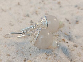 Oorbellen die ik gemaakt heb met 925 zilveren opengewerkte kapjes en grote kralen van seleniet ( satijnspaat ) en facet geslepen rondelles van welo opaal. Totale lengte 42mm.
