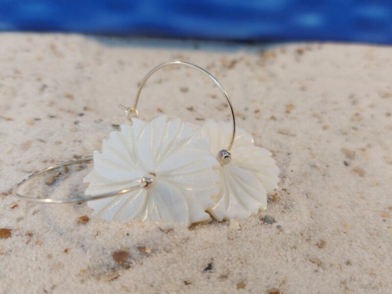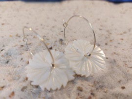 25mm verzilverde oorringen met 925 zilveren kraaltjes en prachtige slepen parelmoer bloemen (schelp)