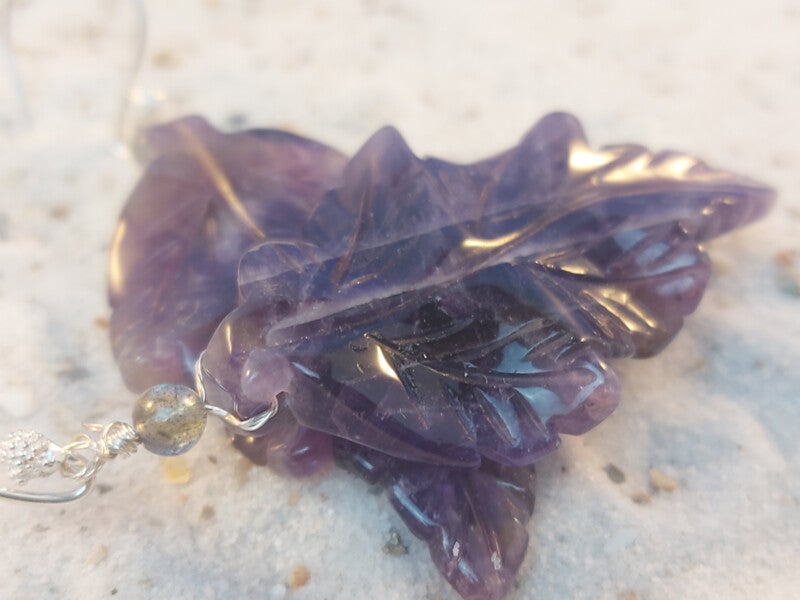 Zo mooi en uniek deze geslepen amethist bladeren die ik met een kraal van labradoriet heb afgewerkt aan 925 zilveren oorhaakjes met bloemknopje, lengte 69mm
