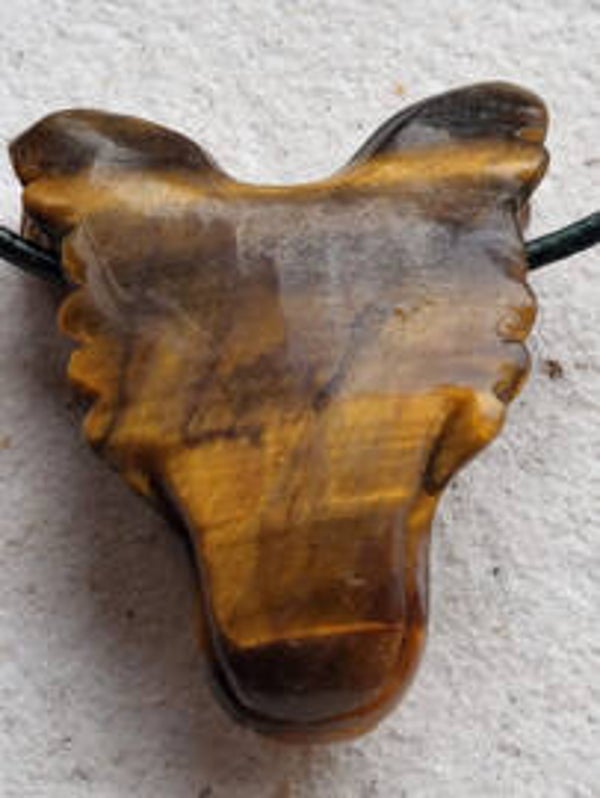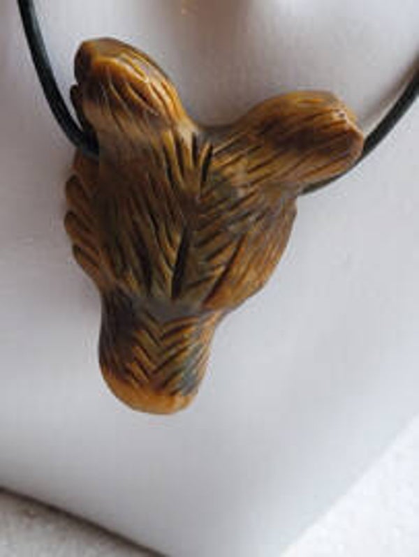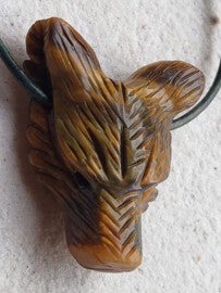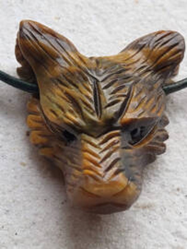 handgeslepen doorboorde wolvenhanger van tijgeroog (kan een 2mm veter door) excl veter 47x38x15mm