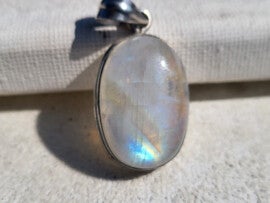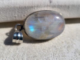 Prachtige grote regenboogmaansteen hanger 925 zilver 40x19mm . zie je die bijzondere gouden streep..