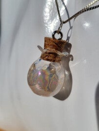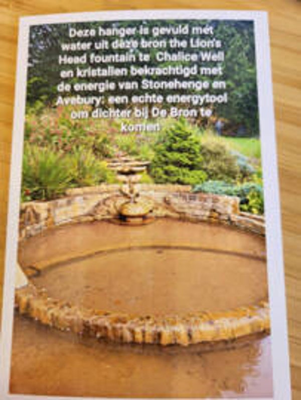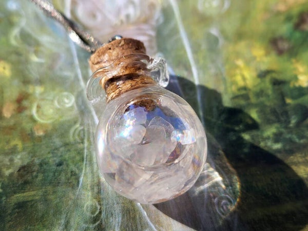 Glazen hanger (33mm totaal) met regenboogglans gevuld met water uit de Lion's Head Fountain en rozenkwarts kristallen bekrachtigd met de energie van Stonehenge en Avebury: een energytool om dichter bij De Bron te komen. Excl ketting incl bijbehorende kaart van de Chalice Well