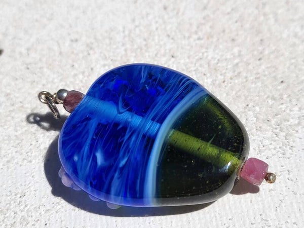 Deze handgemaakte glashanger 49x27mm (glas kraal gemaakt door Cora Hellings) met roze toermalijn prachtige tree met lavendel bloemen
