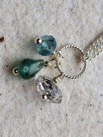 verzilverde ketting 50cm (wil je andere lengte vraag mij wat mogelijk is) met 925 zilveren bedel met een facet geslepen apatiet, een freeform apatiet en herkimer diamantje , lengte 22mm