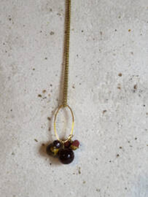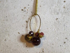 Goudkleurig ketting 63,5 cm met goudkleurig bedel met tijgeroog, mookaiet en facet geslepen granaat