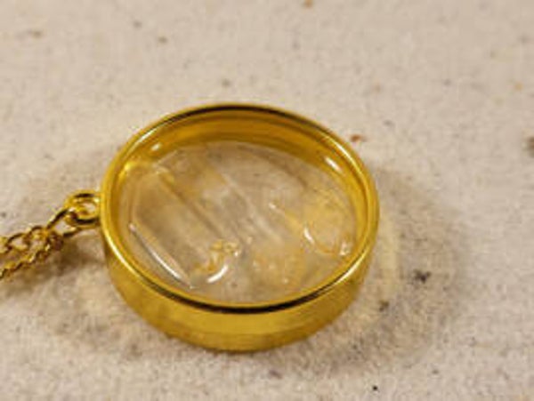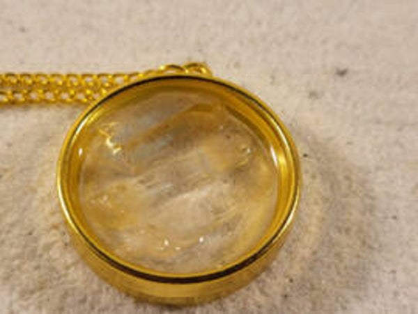 Gouden hanger met roze Lemurische kwarts in resin..30mm doorsnede excl ketting
