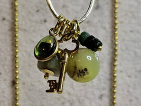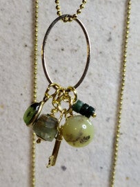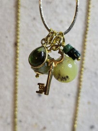Ketting met groene toermalijn, jade, dendriet opaal, groene opaal en vermeil sleuteltje. Deze ketting ondersteunt jouw reis naar jouw pure hoger, om dit in zijn totaliteit te omarmen . De ballchain ketting is 1 meter maar makkelijk korter te maken