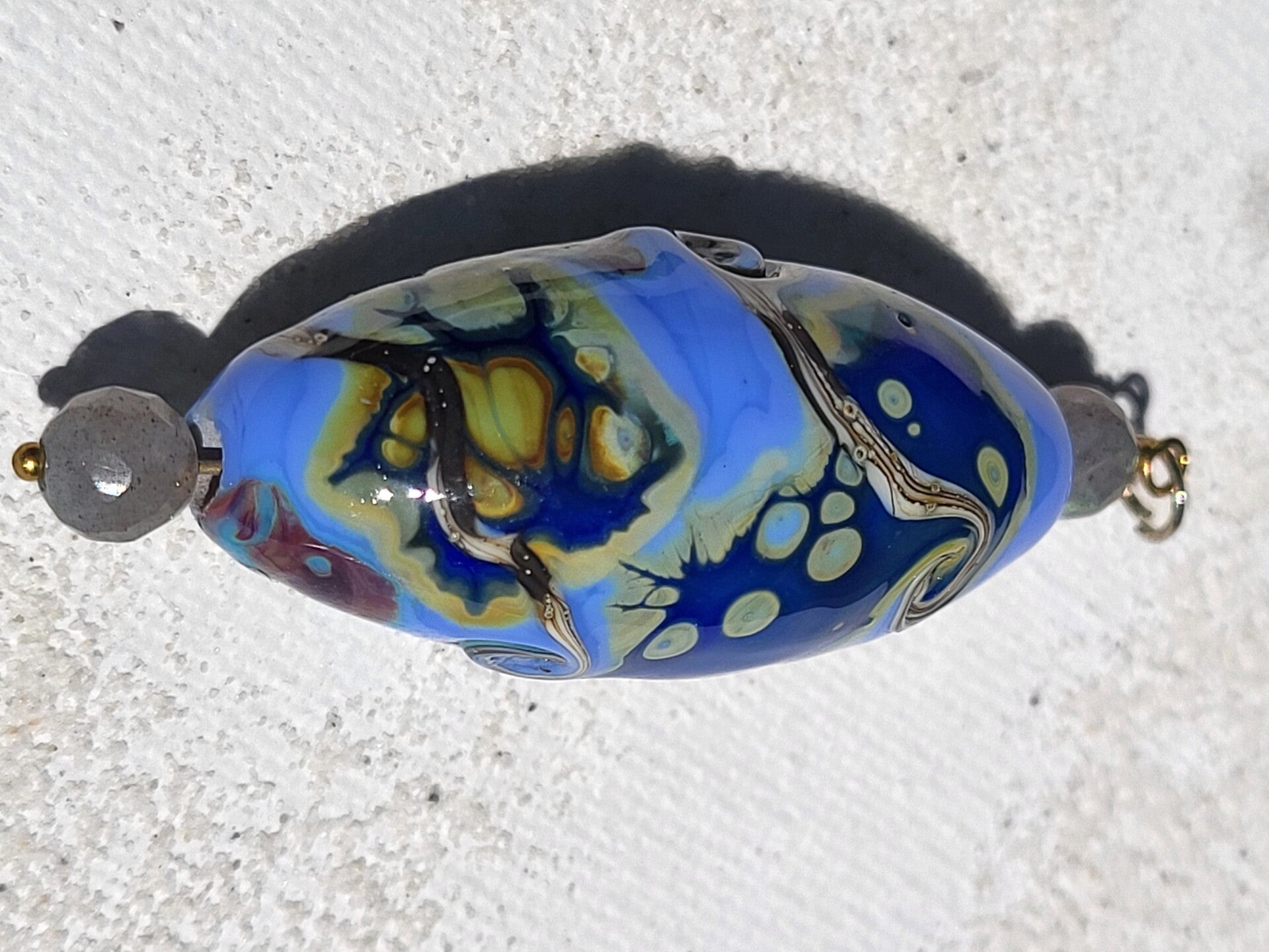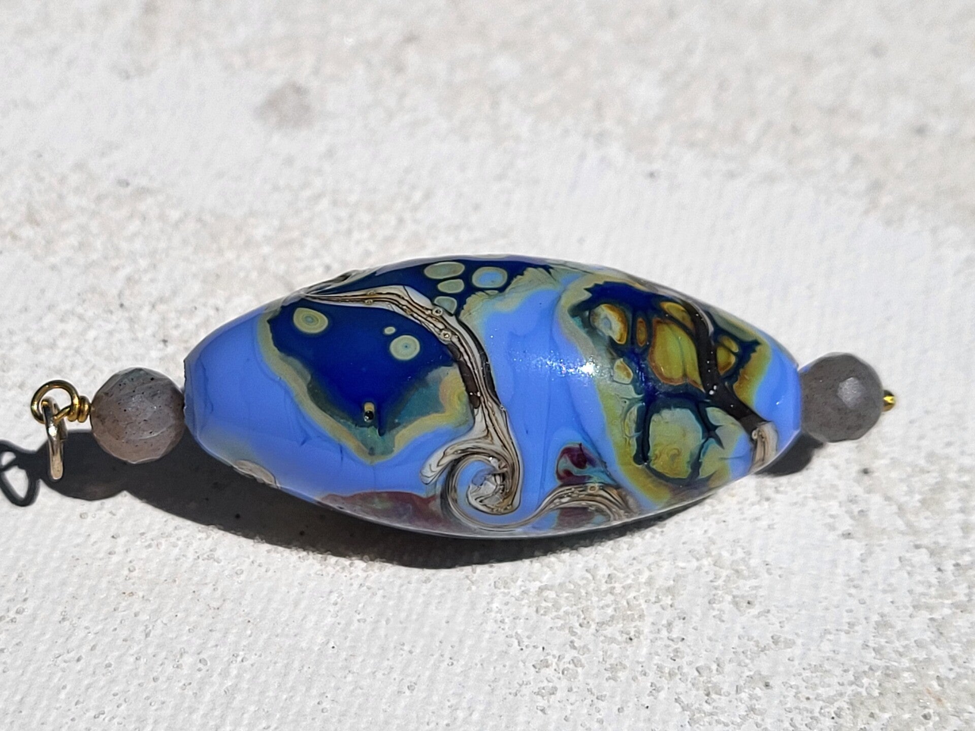 Deze handgemaakte glashanger met prachtige kleuren en tekeningen 59x18mm (glas kraal gemaakt door Cora Hellings) met angeliet (deze geef ik de naam Flying with Angel wings).