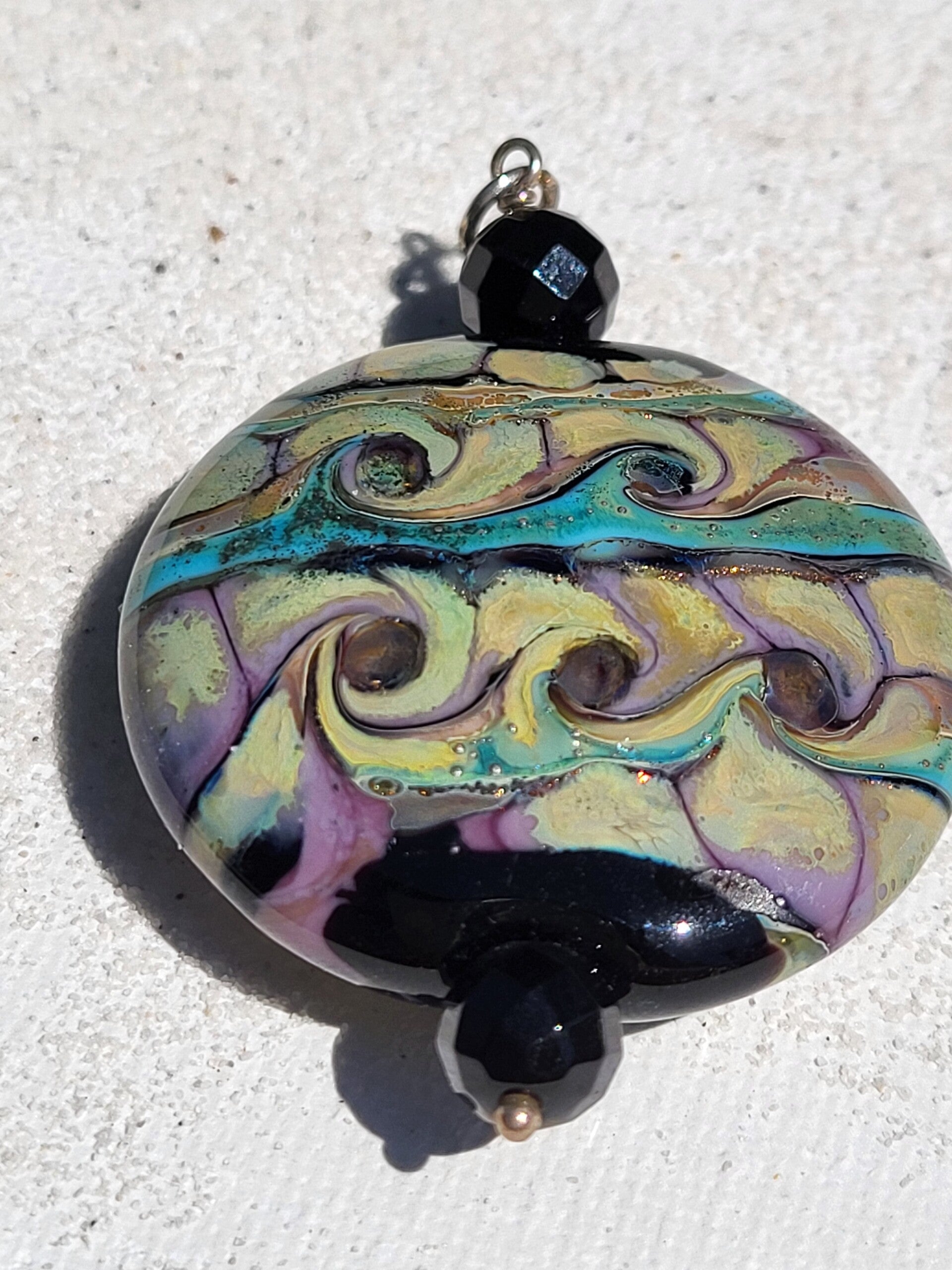 Deze handgemaakte glashanger 59x40mm (glas kraal gemaakt door Cora Hellings) met onyx (deze geef ik de naam back and forth).