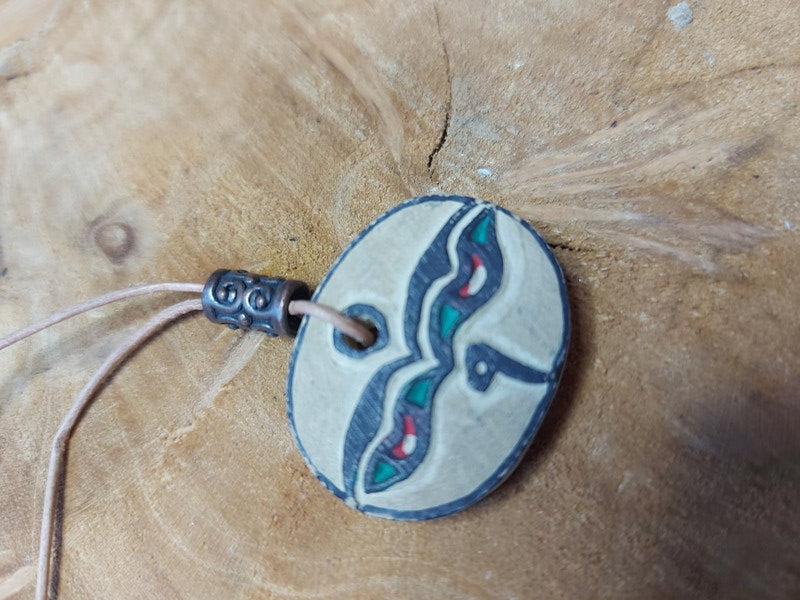 Mooie aardse gelukshanger uit Tibet, handgemaakt door bewoners zelf uit klei. Prachtige verbinding met Moeder Aarde en om te aarden. aan lederen veter 31x24mm