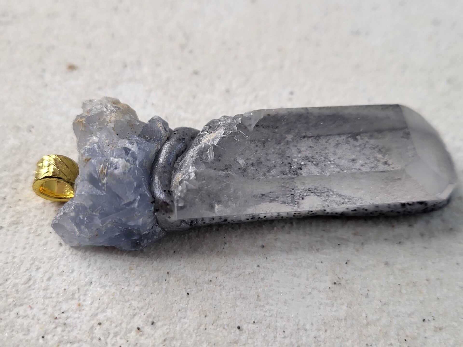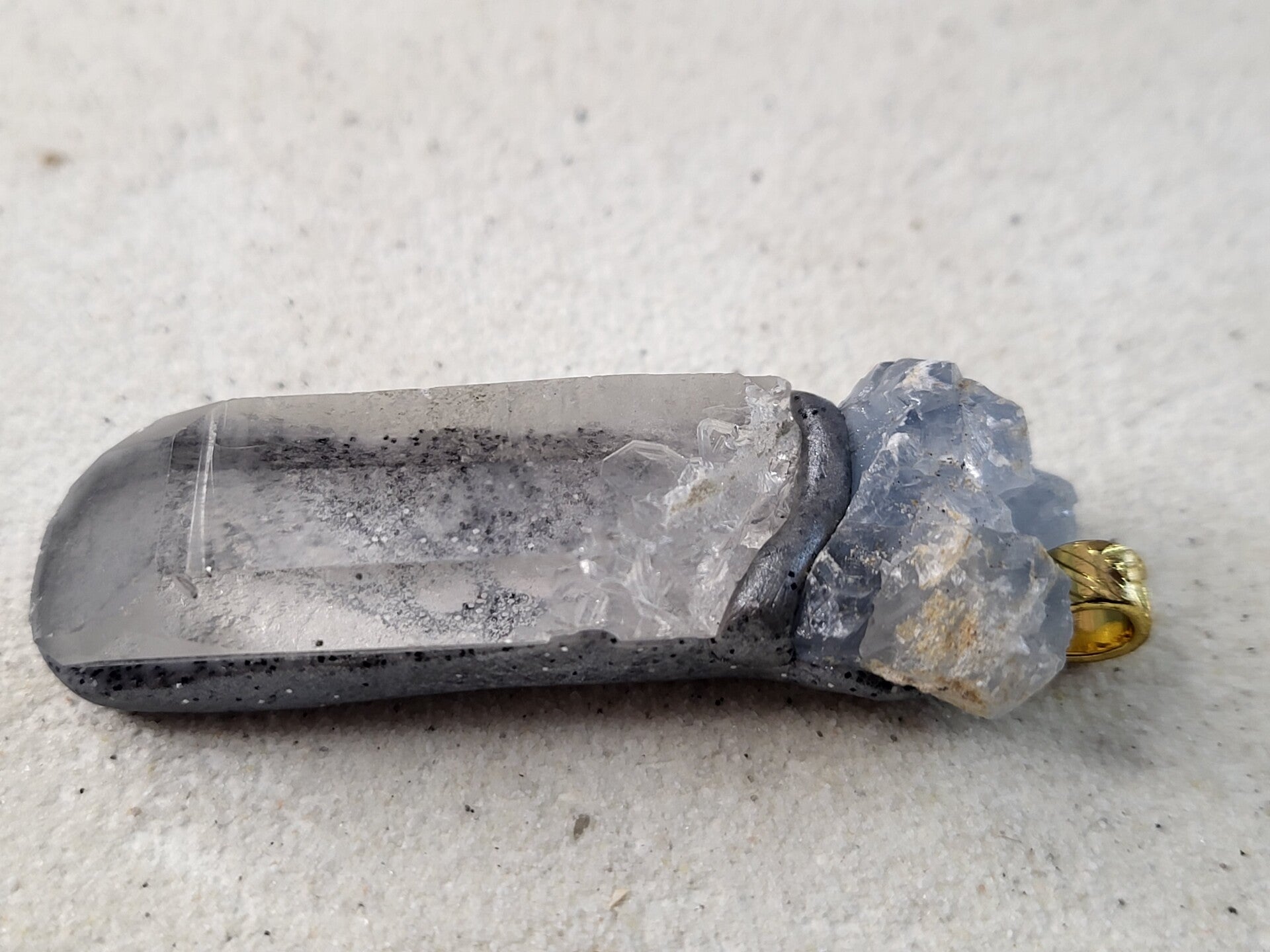 Hanger gemaakt met een Lemurische kwartspunt vol coderingen en een stukje celestien 60x11mm ezxcl lederen veter. Deze hanger heb ik gemaakt ism lichtteam en staat voor innerlijk weten