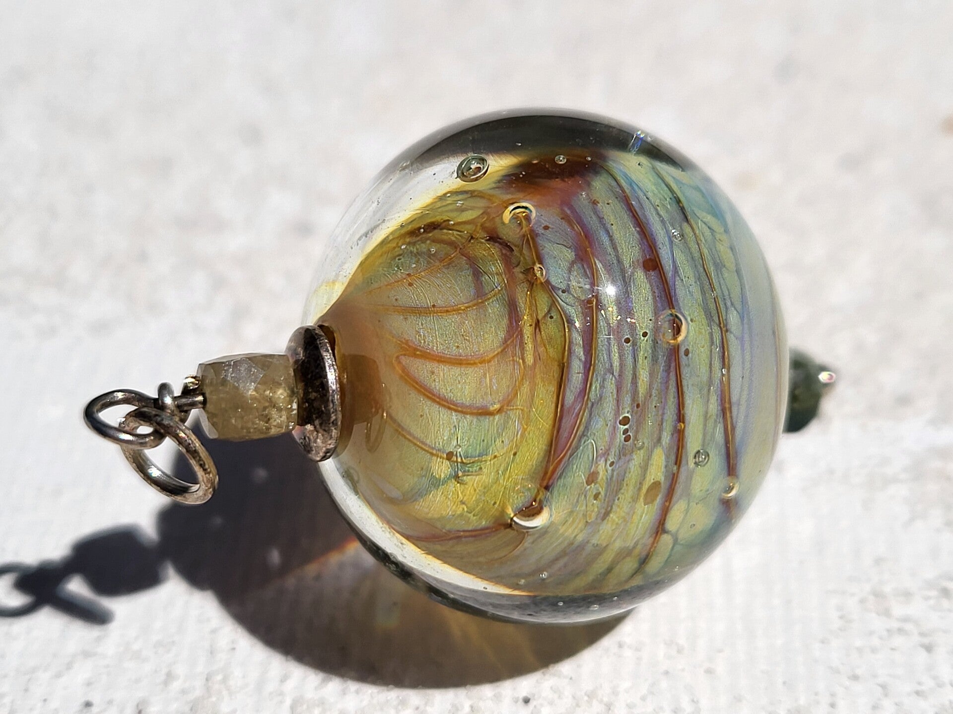 Deze 925 zilveren handgemaakte glashanger 24mm doorsnede ( glas kraal gemaakt door Cora Hellings) met watermeloentoermalijn, geel en groen (deze geef ik de naam inner knowing).