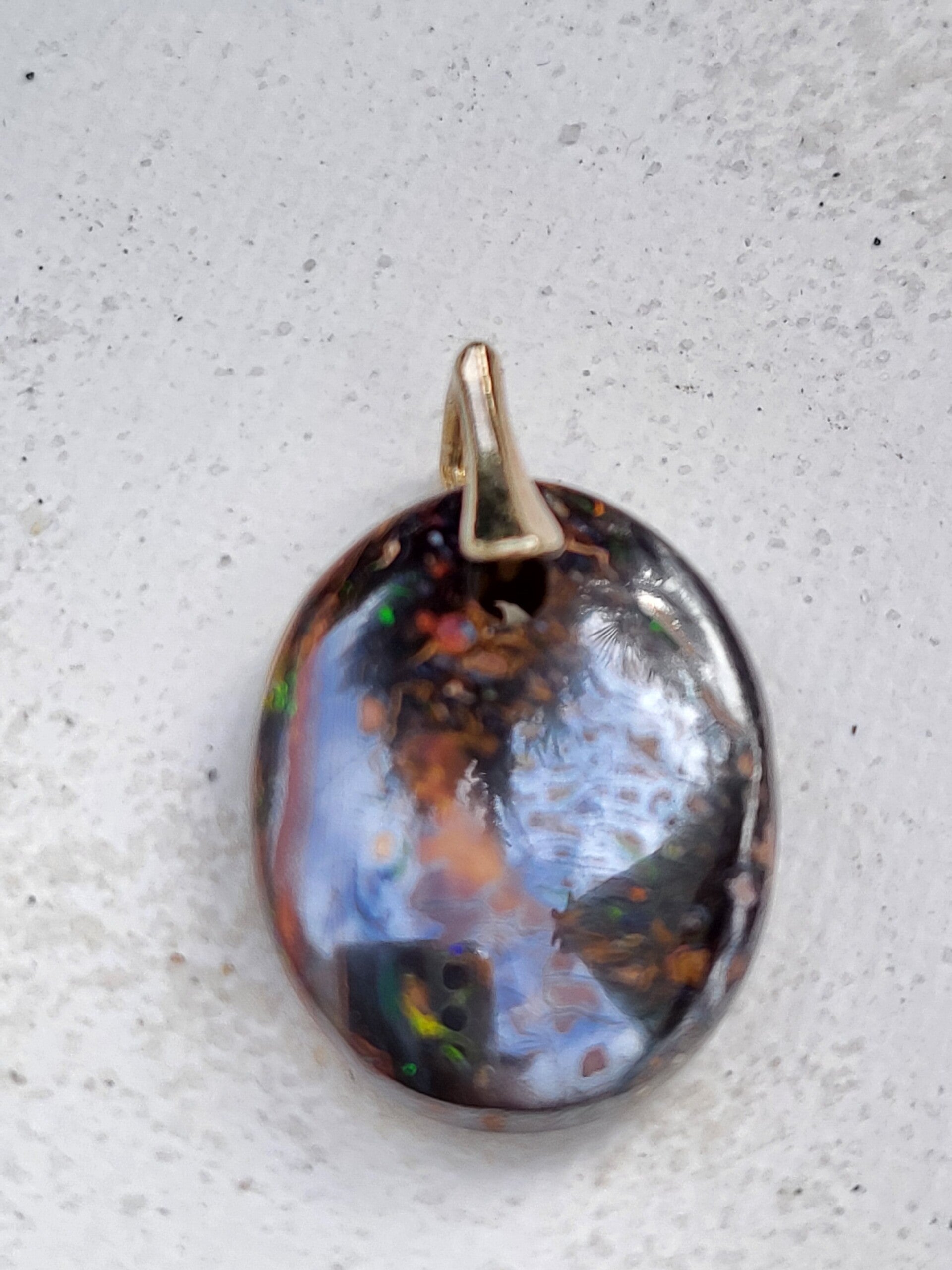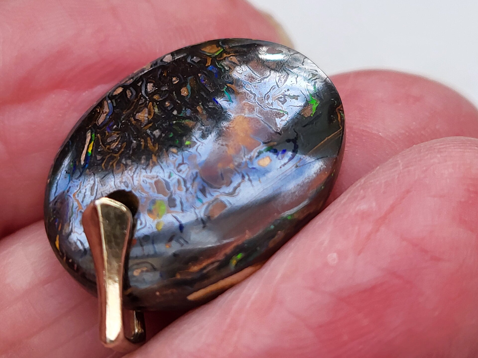 Vermeil ( kan ook zilver) hangertje van boulder opaal uit Australië .. met prachtig vuur erin. 26x17mm het "vuur " is moeilijk vast te leggen