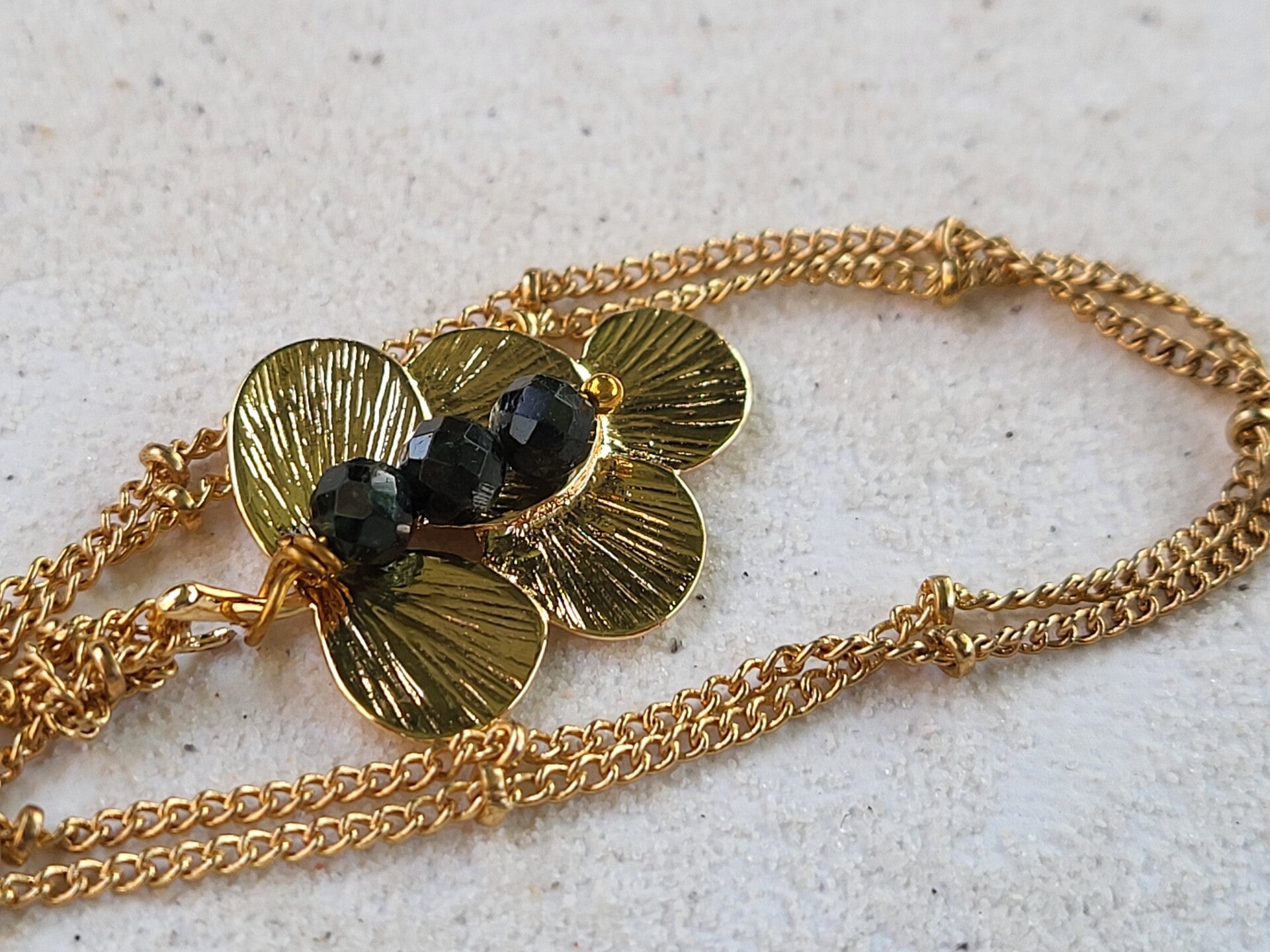45 cm gouden ketting (kan evt verlengketting aan) met blaadje en facet geslepen groene toermalijn