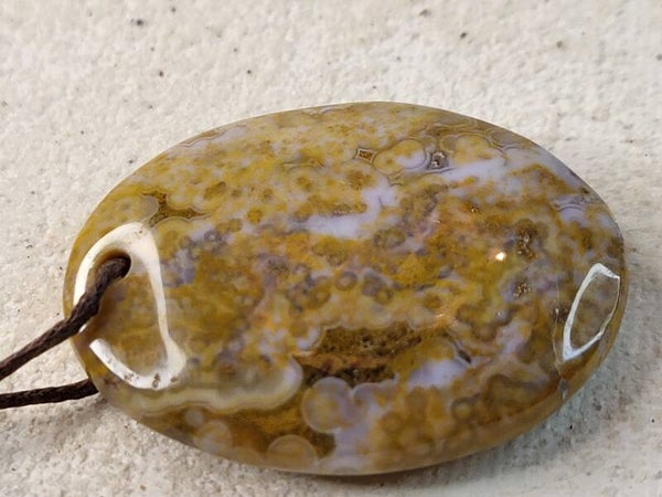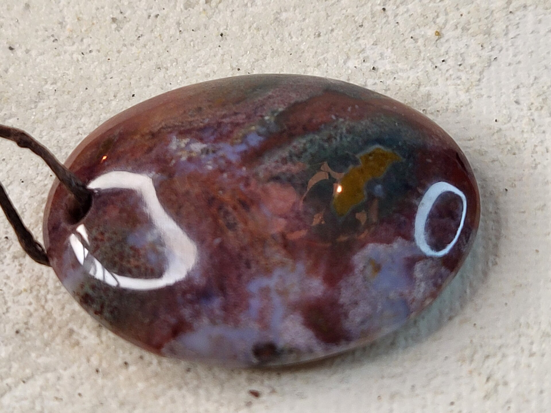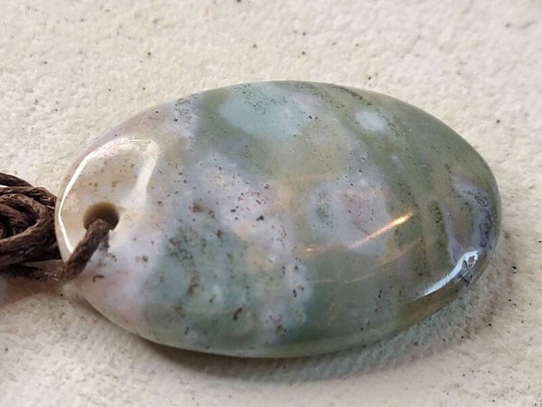 Oceaan jaspis hangers incl bruin waxkoord. Wil je hangoog vraag wat mogelijk is. formaat rond 38x28x8mm