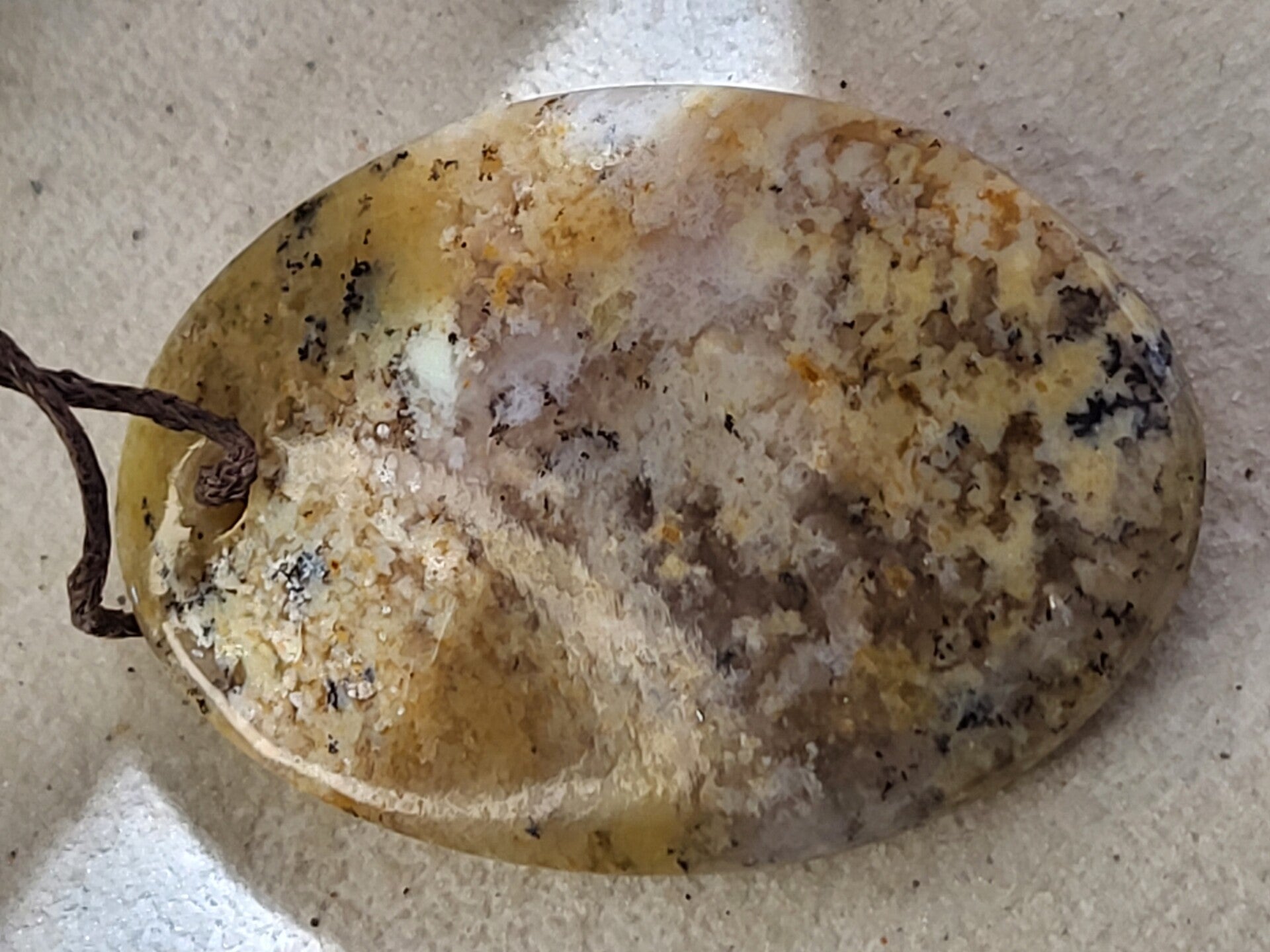 Groen opaal hanger ( kan aan lederen veter ,1 of 2mm, hangoog, ringetje etc vraag wat mogelijk is) 49x31x8mm incl bruin waxkoord