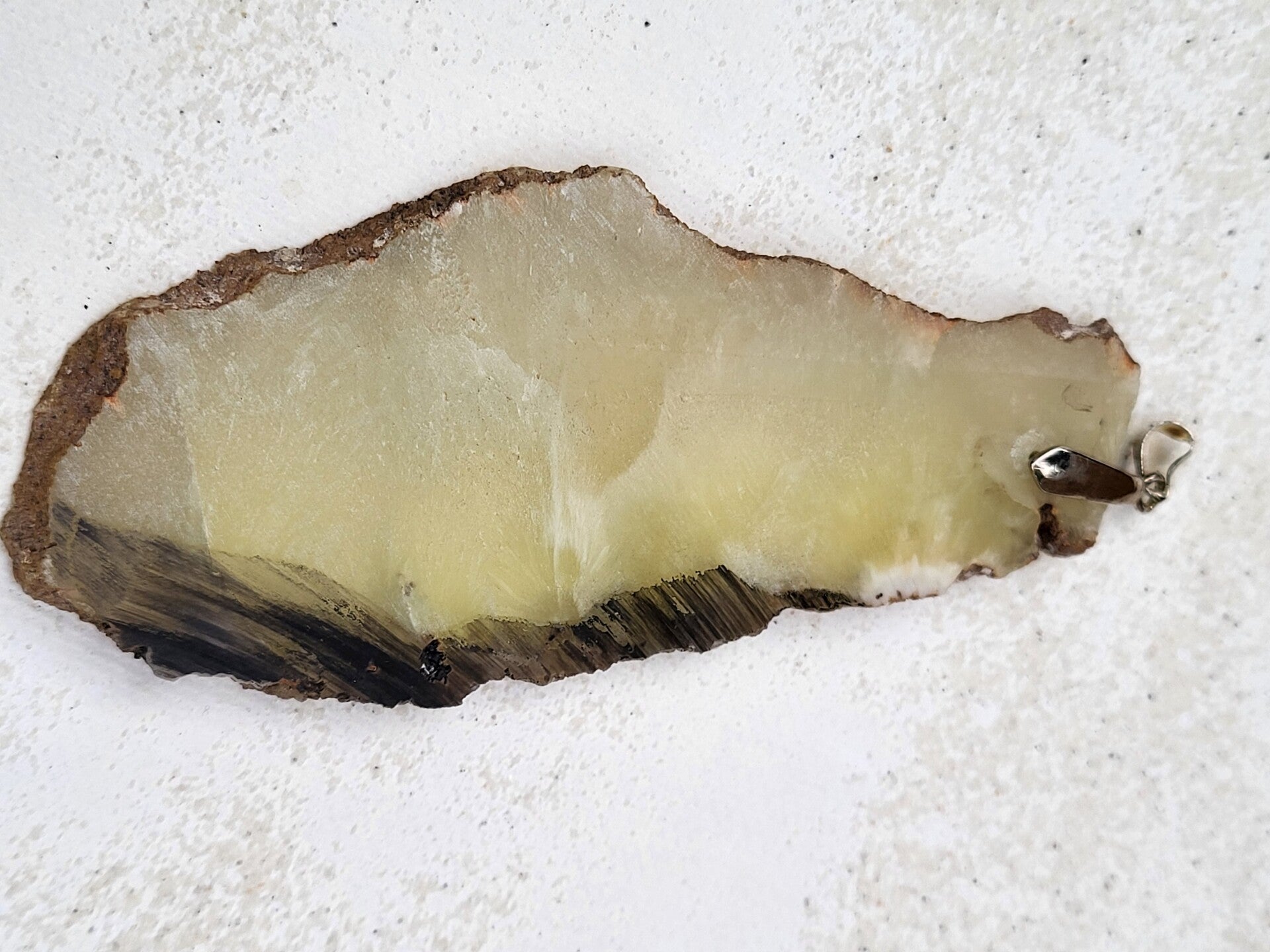 Grote hanger prehniet 102x40x4mm zelf gemaakt: zagen, slijpen ism lichtwereld