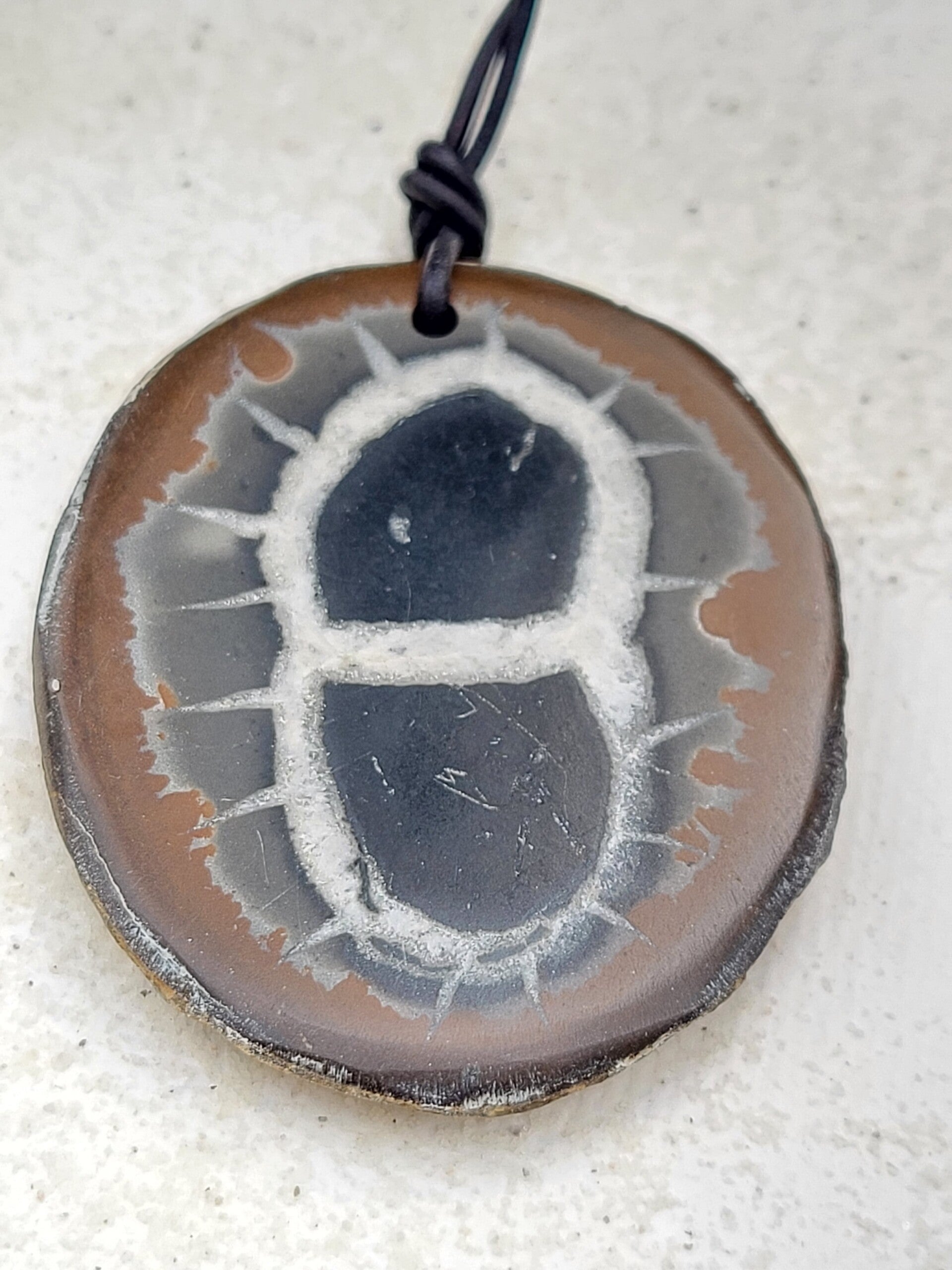 Hanger Septarie 42x34mm ( zelfde steen als drakeneieren) je ziet de stukjes pyriet of foolsgold zitten.. incl of lederen veter of zilveren-, gouden- of bronzen hangoog ( geef dit aan bij opmerkingen of mail mij apart hierover ) Ook erg mooi aan 3mm gevlochten lederen veter zoals laatste foto... deze is ook verkrijgbaar op maat