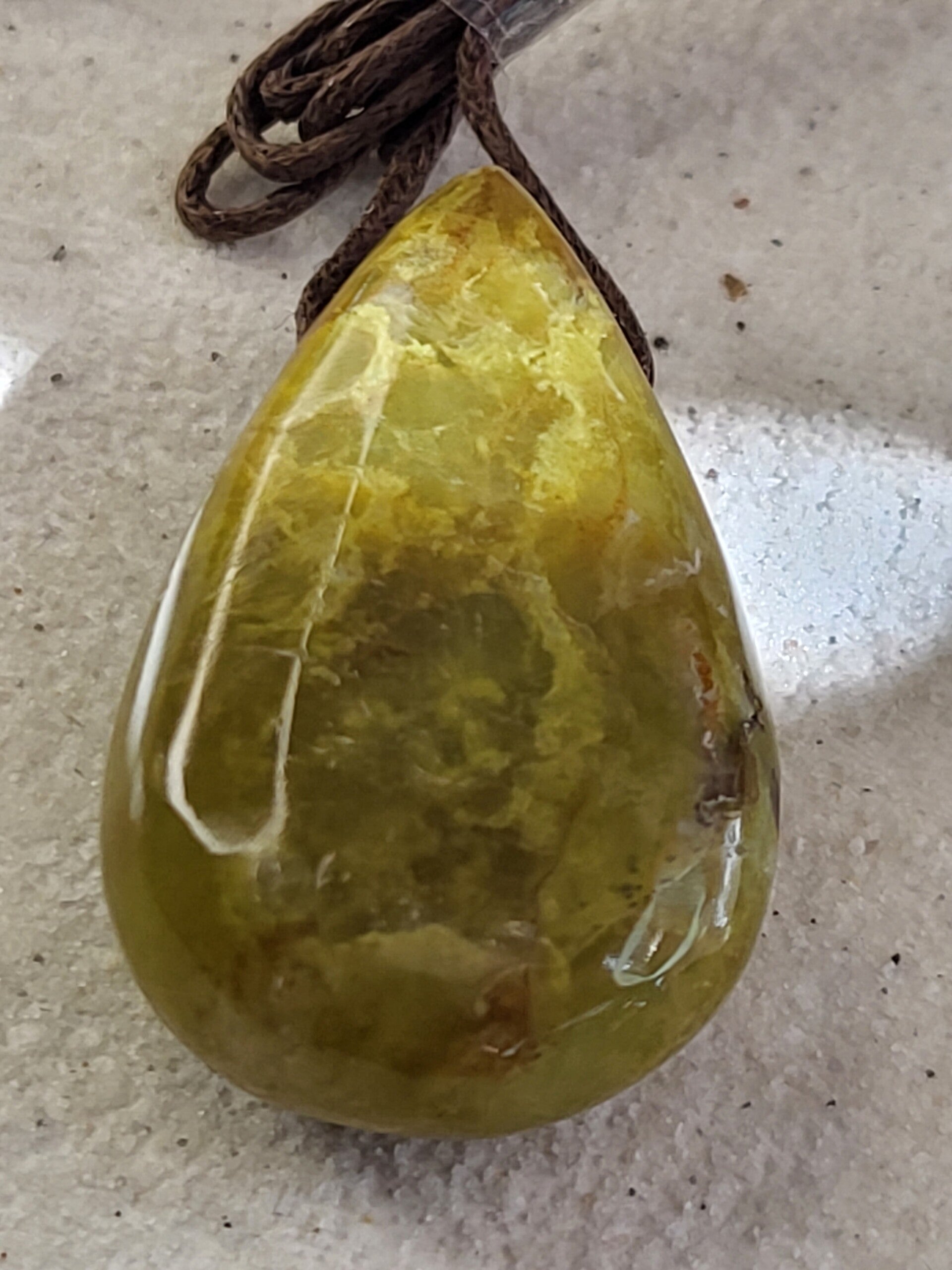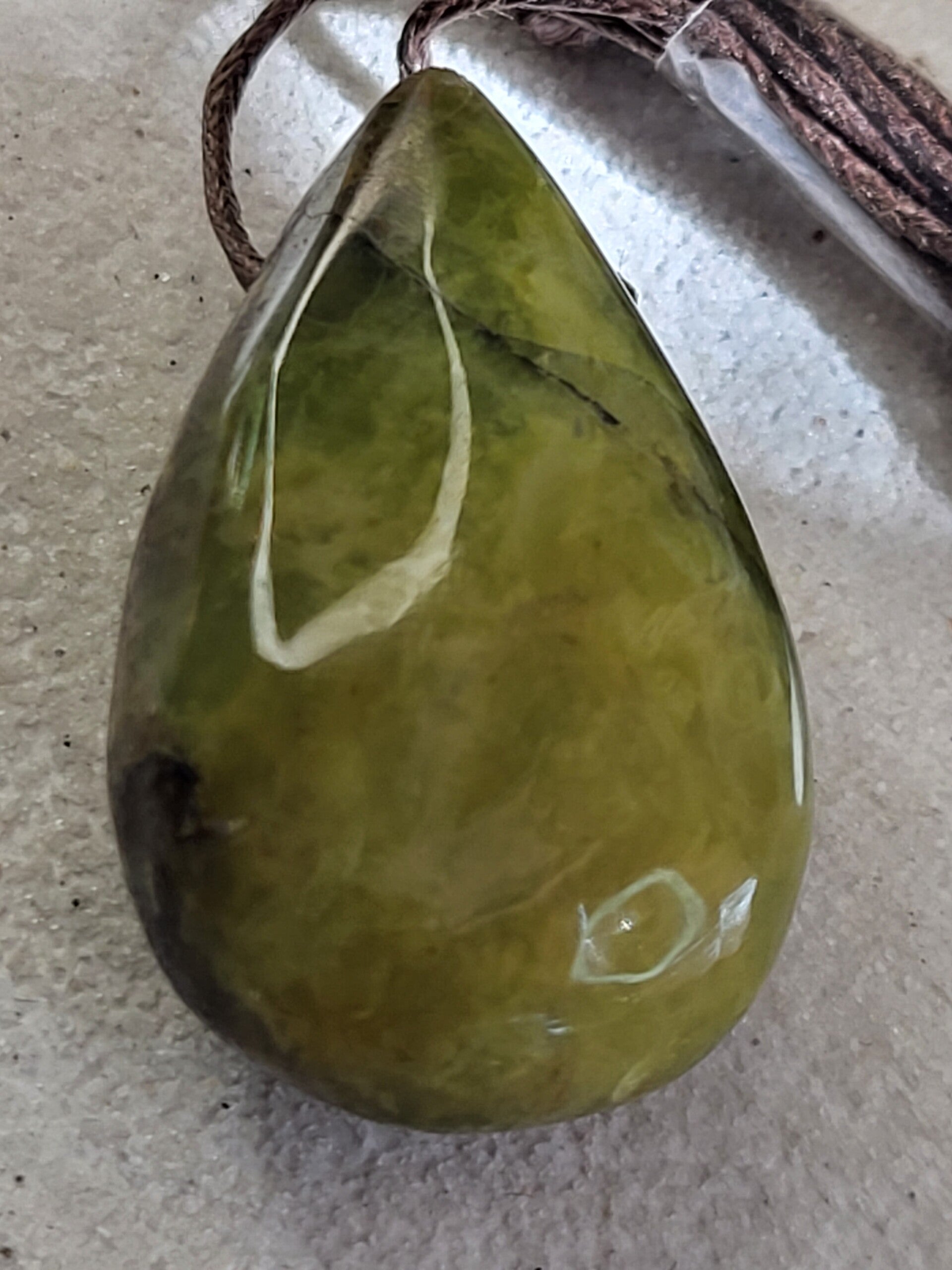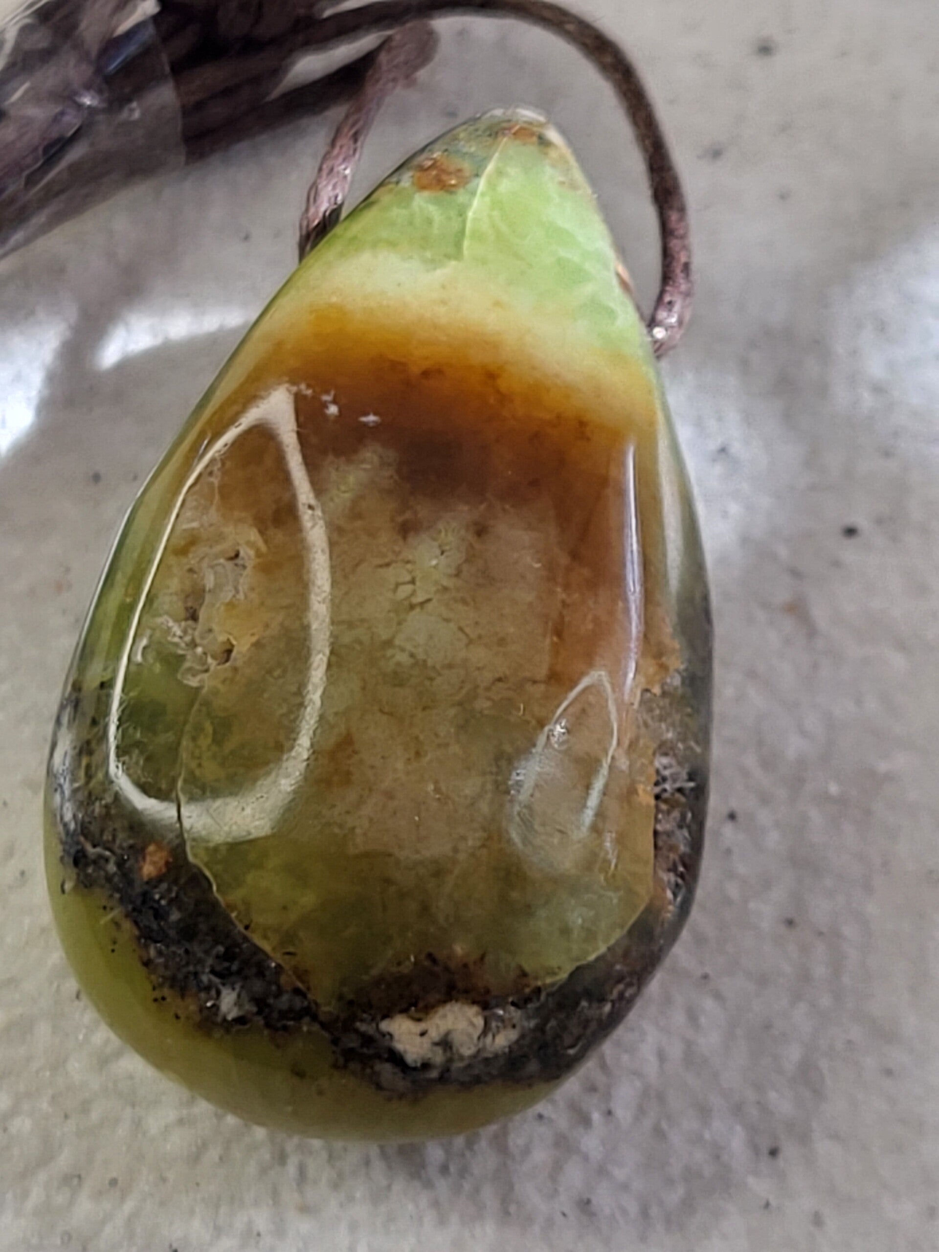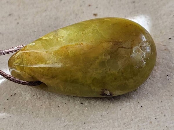 Doorboorde groene opaal hanger (rond 35x20mm) incl bruin waxkoord leuk aan lederen veter maar ik kan er ook een ketting van maken met kralen.