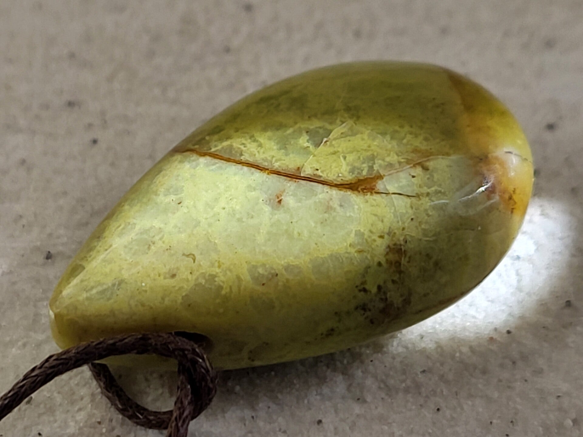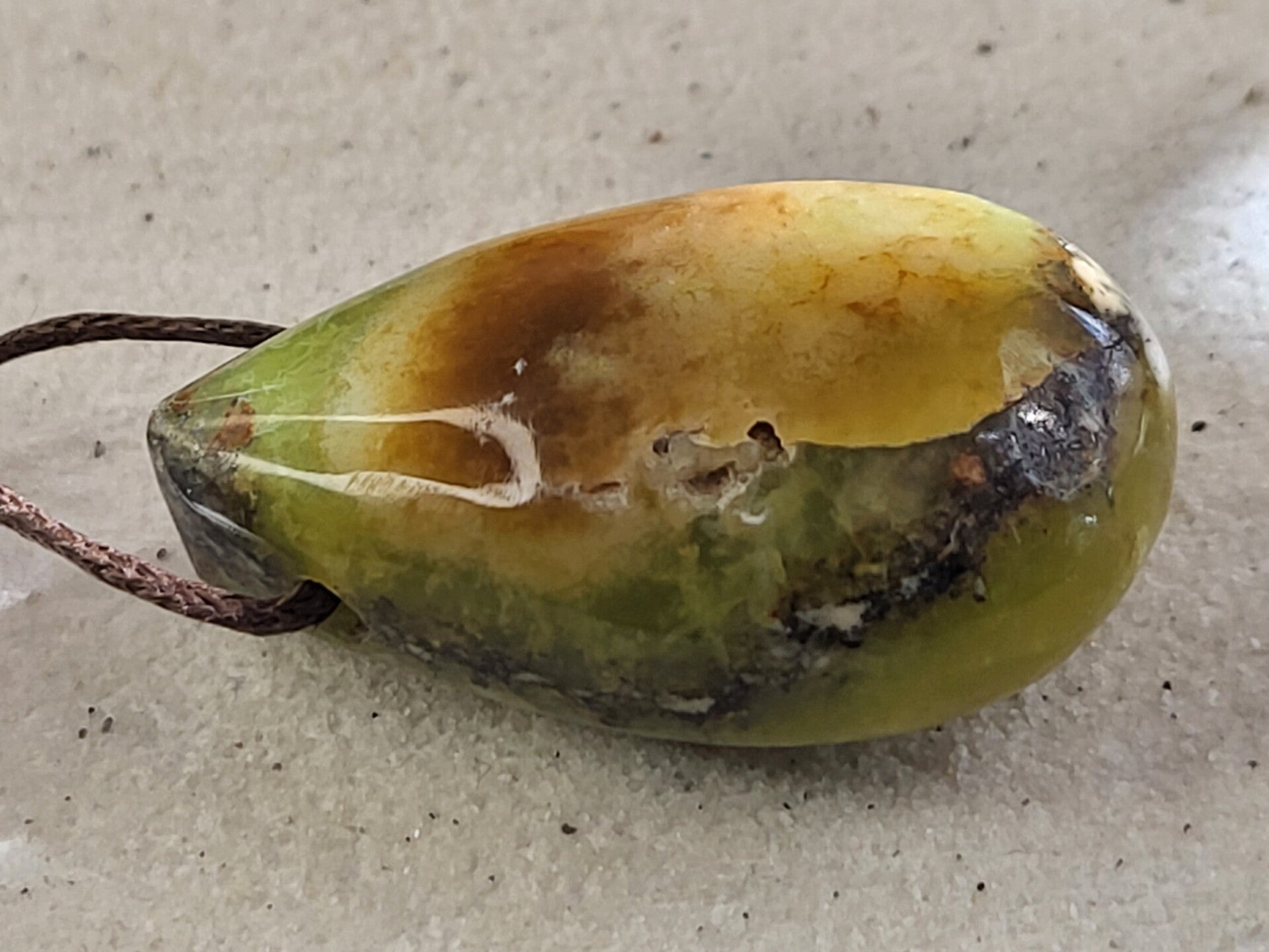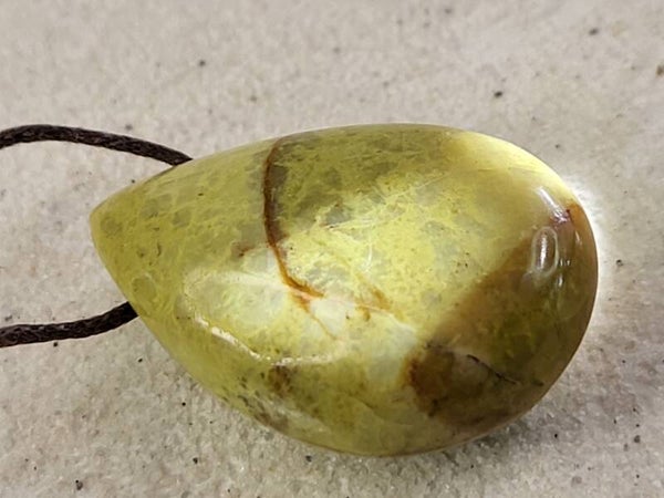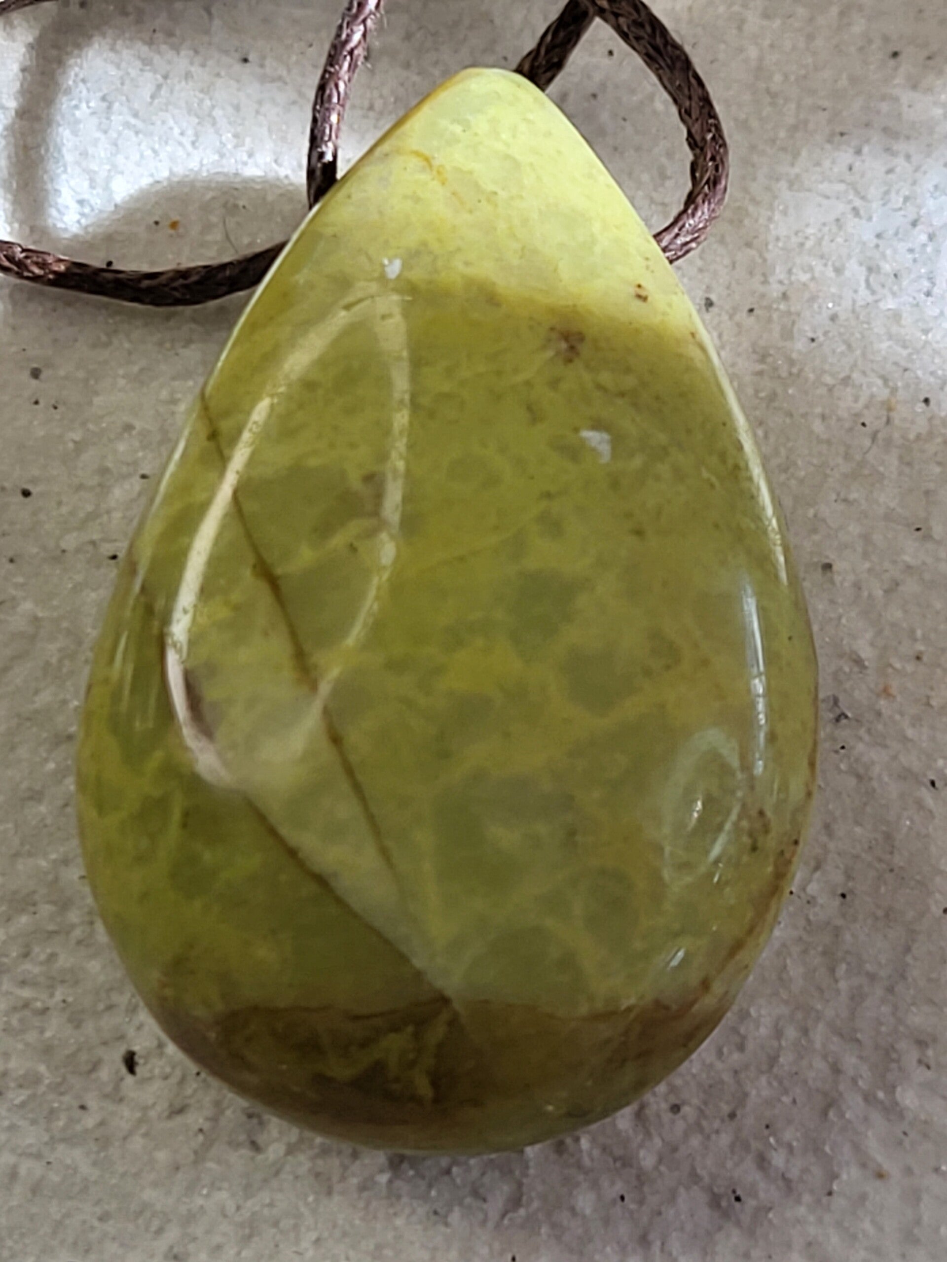 Doorboorde groene opaal hanger (rond 35x20mm) incl bruin waxkoord leuk aan lederen veter maar ik kan er ook een ketting van maken met kralen.