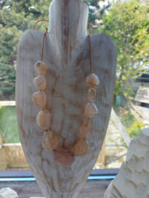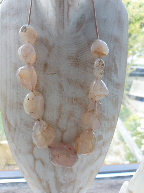 Unieke ketting van roze chalcedoon (zeer zeldzaam)...prachtig statementstuk...aan lederen veter zodat hij toch prettig om te dragen is....ondanks dat een zwaardere ketting is ..grootste kraal is 39x30mm..echt een heel bijzonder item .
