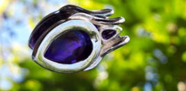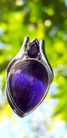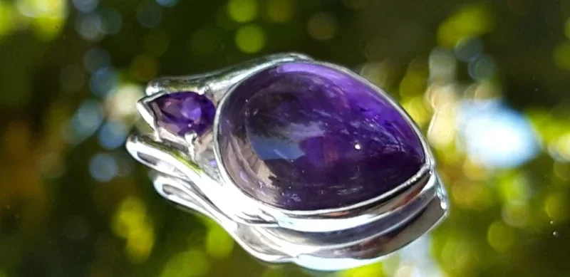 Prachtige hanger met een amathist cabouchon en klein facet geslepen amethist. Deze sieraden zijn van juwelierskwaliteit dus de mooiste stenen en zwaar zilver.